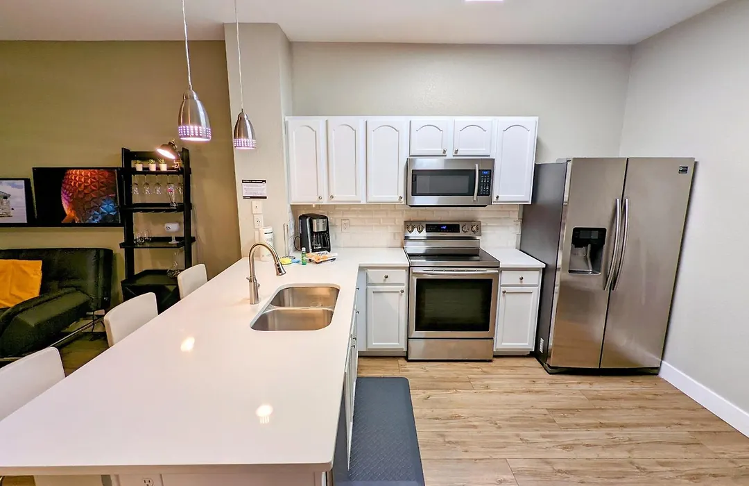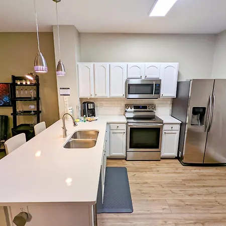 New Luxury Disney Townhome At Windsor Hills Resort, 3Bed 3Bath, Private Pool Parking Wifi Included villa features an equipped kitchenette fitted with coffee and tea makers, a refrigerator, and kitchenware.